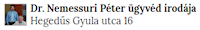 Dr. Nemessuri Péter ügyvéd: polgári és büntetőügyek, adójog, informatikai jog, társasági jog, szerződések, képviselet, tanácsadás. A Magyar Bitcoin Egyesület alapító tagja. |